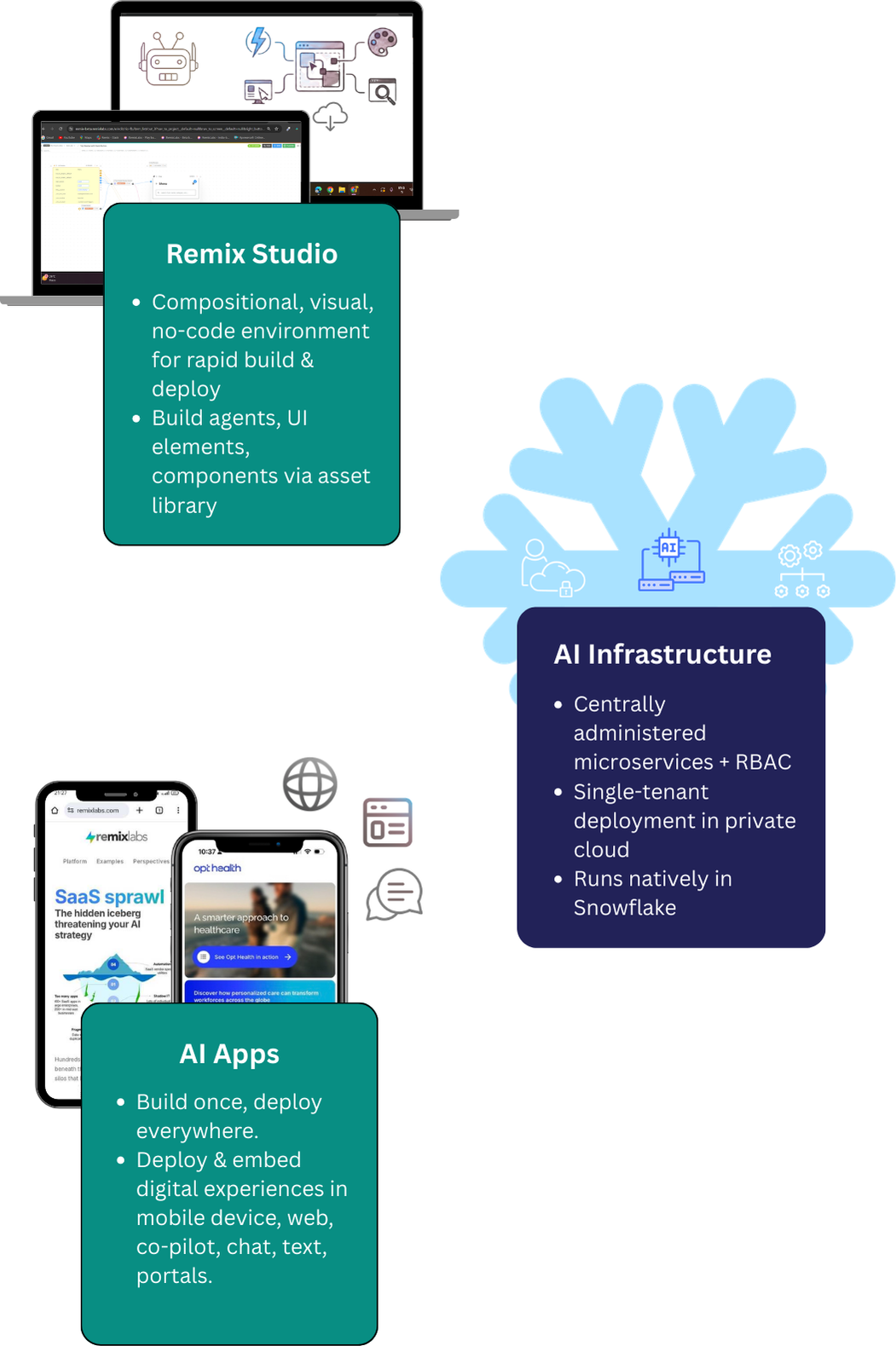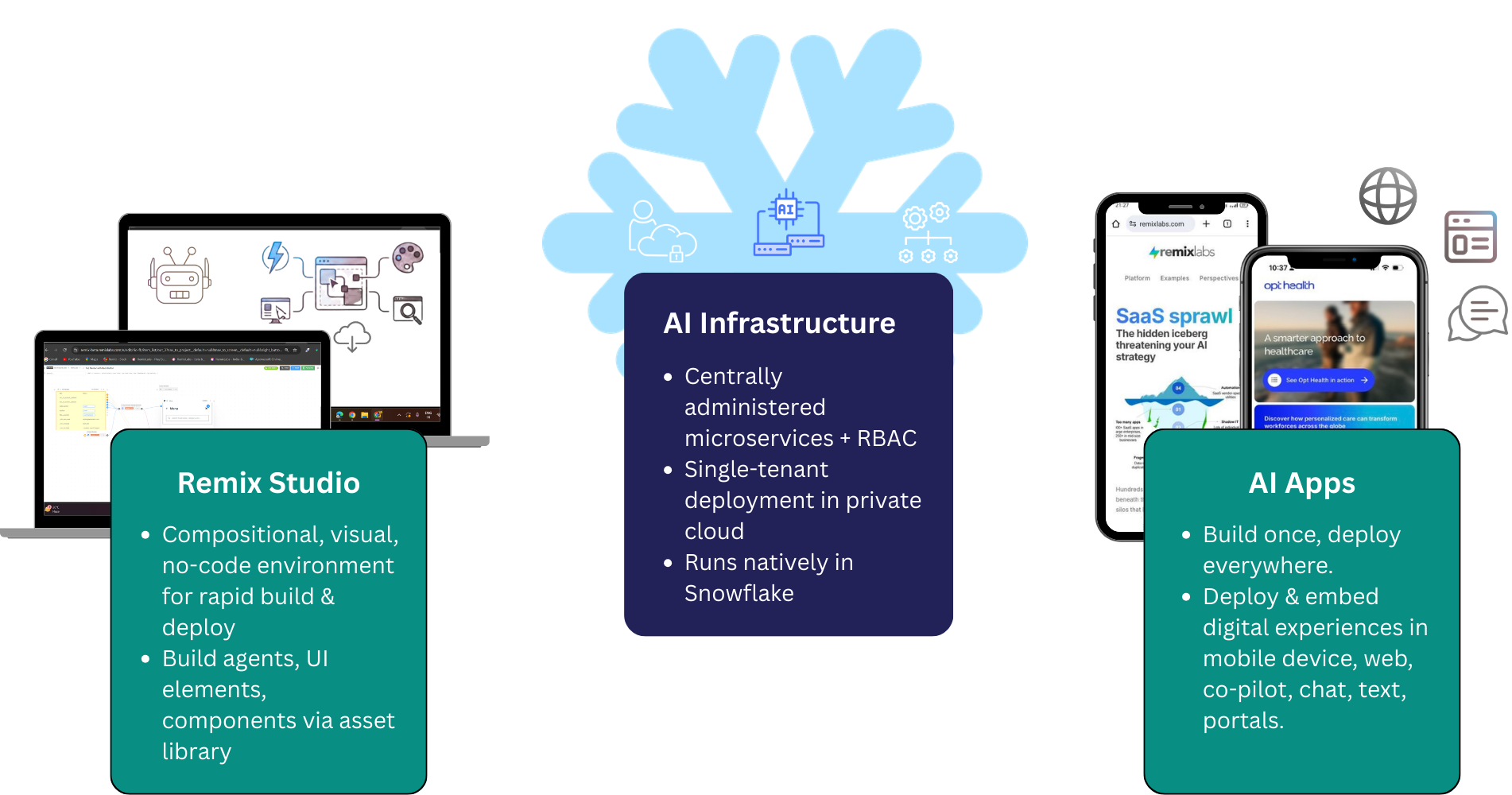 Remix turns Snowflake into an intelligence platform. Deploy governed AI experiences everywhere—from mobile widgets to agentic workflows—all running natively in Snowpark.